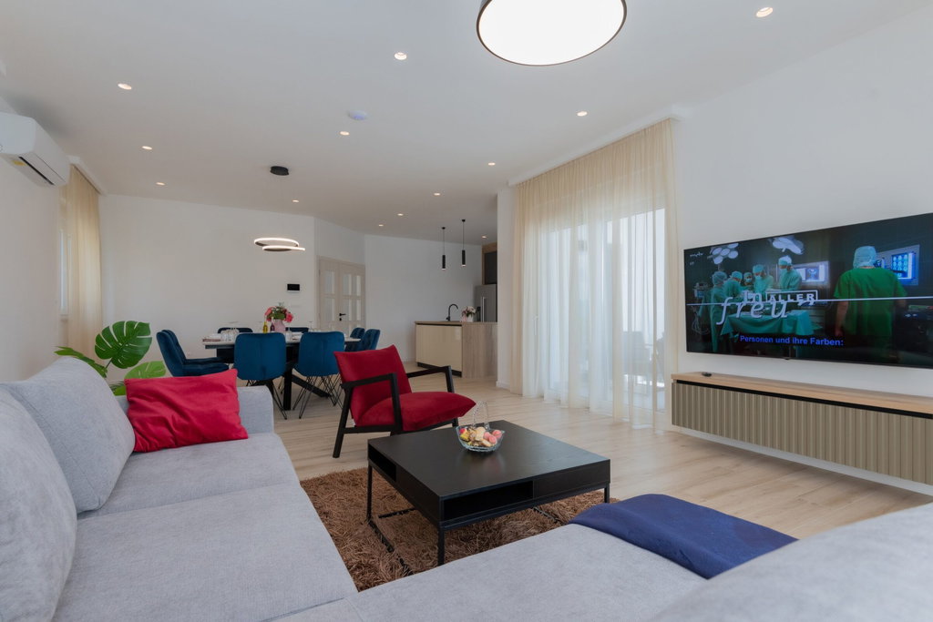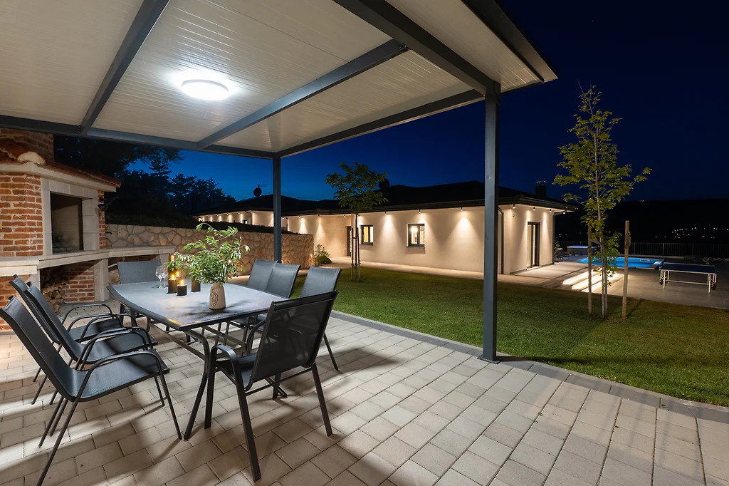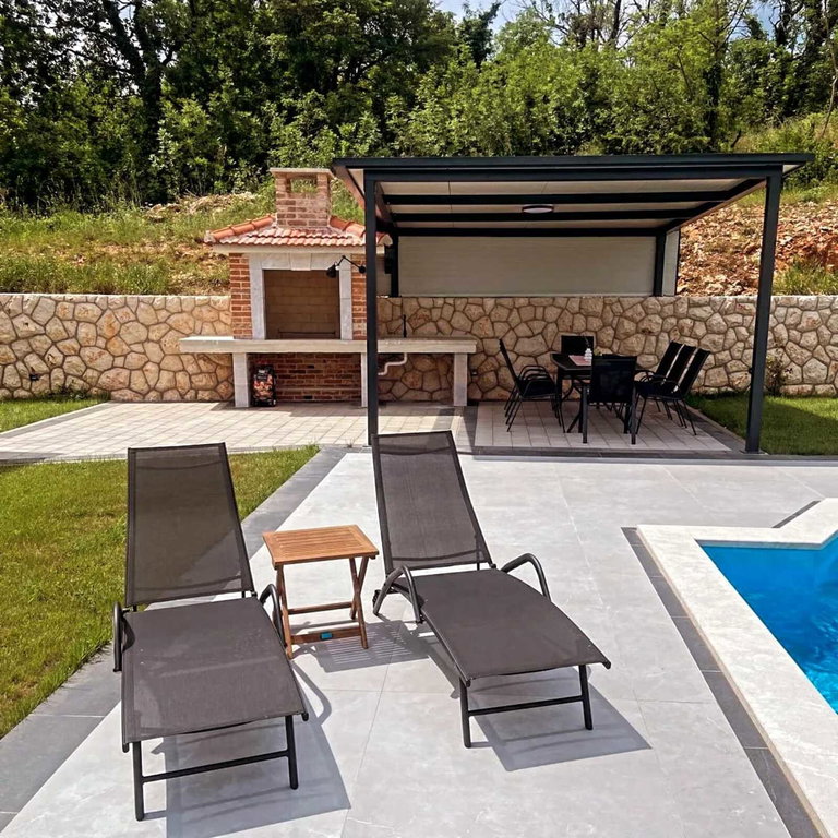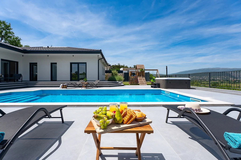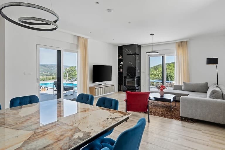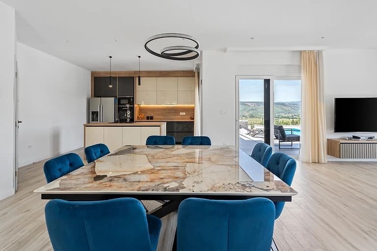 A modern, beautifully furnished house of 165 m2 is for sale, situated on a spacious 1040 m2 plot in the peaceful and idyllic surroundings of the Dalmatian Hinterland. The property offers complete privacy, comfort, and a spectacular panoramic view of the town of Imotski, as well as the Blue and Red Lake. The lakes are recognized as a UNESCO Global Geopark, and the entire area is rich in exceptional cultural heritage and well-preserved historical landmarks. Main features: Living area: 165 m2 Gross area: 180 m2 Plot size: 1040 m2 Open-space living room with large glass walls Modern, fully equipped kitchen and dining area 3 spacious bedrooms 3 bathrooms 1 guest toilet Large terrace with landscape views Heated swimming pool (32 m2) Garden Sauna Outdoor jacuzzi Storage room Children’s playground Private parking The terrace also includes a covered outdoor dining area with a traditional wood-fired grill. All rooms are equipped with air conditioning, the doors are security-reinforced, and the house features underfloor heating and a heat pump system. The property is oriented toward all four cardinal directions and holds an A-class energy certificate. Distance to the beautiful beaches of Makarska is 19 km, and to the city of Split 70 km. This property is ideal for vacationing or year-round tourism. For any additional questions or to arrange a viewing, feel free to contact us. In the event of an agency-mediated transaction, an agency commission fee applies. Contact for this property: Jasmina, +385 95 388 4813