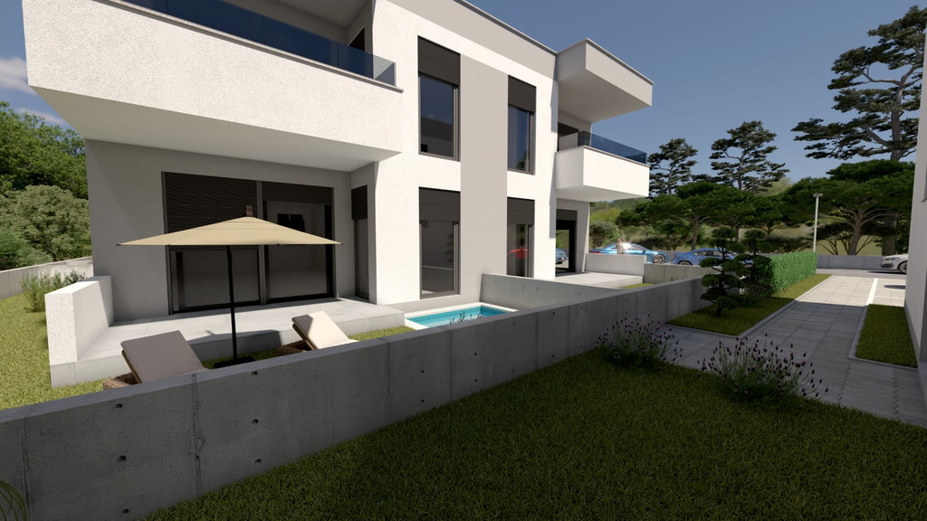 For sale is a modern apartment in Kožino that combines high-quality construction, comfort, and proximity to the sea. The 69.73 m2 apartment consists of an entrance hall, kitchen, dining area, bright living room with access to a spacious terrace, two bedrooms, and a private garden of 24 m2. The apartment comes with two parking spaces, and there is the option to build a pool for an additional fee. The beautiful Adriatic Sea is only 1,500 meters away, making this property a perfect choice for those who want to enjoy a peaceful seaside environment. The apartment is equipped with underfloor heating, electric shutters, security doors, alarm system, and video intercom. Air conditioning units will also be installed for maximum comfort throughout the year. Expected completion of construction is the end of 2026. The price for private buyers is €3,490/m2 including VAT, with the possibility of purchase via a housing loan. A 12% deposit is required at contract signing, and the remainder is paid after loan approval. For buyers paying in cash, the price is €2,990/m2, with payment carried out in three stages, which makes this offer extremely attractive for further investment. This property is a perfect combination of modern living and investment opportunity. If a lower price for this property is published on another website, the same price applies with us. In the case of mediation by our agency, an agency commission is required. For any additional questions or property viewings, we are at your disposal. Contact for this property: Vito, +385 91 622 7421