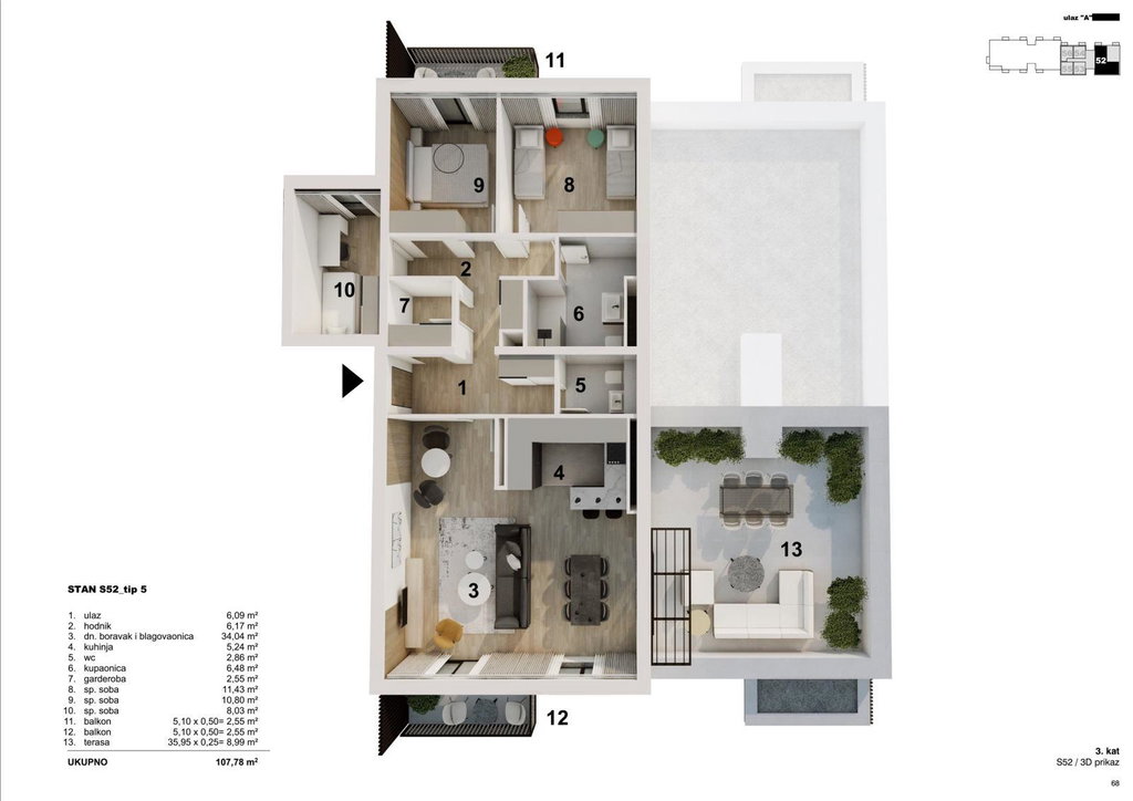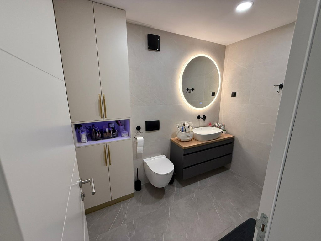 Modern luxury and comfort of everyday life in the heart of Botinec At an excellent location in the settlement Botinec, right next to the elementary school Braće Radić and kindergarten, is located this high-quality new building designed according to contemporary standards of safety and comfort. In the immediate vicinity there are all necessary facilities for a pleasant everyday life – market, shops, health center, church, cafés, and bakeries, while Arena Zagreb is only one kilometer away. ________________________________________ Top construction and contemporary standards The apartment is located in a building made of reinforced concrete construction, with a façade thickness of 15 cm insulated with a combination of rock wool and styrofoam, which ensures excellent energy efficiency (certificate A+). Walls between apartments are additionally sound-insulated, and internal partition walls are made in drywall system with double panels. Underfloor heating with a condensing boiler enables individual regulation of temperature in each room via thermostat, while in bathrooms and kitchen ventilation systems with hood connection are installed. The entire surroundings of the building are arranged, and the building is equipped with an elevator and color video intercom system. ________________________________________ Luxuriously equipped apartment with carefully designed layout This spacious and bright apartment is located on the third floor and extends to a total of 107.78 m2 of living area, carefully organized to maximize space use and provide a sense of comfort and airiness. It consists of: • entrance area (6.09 m2) • hallway (6.17 m2) • spacious living room and dining area (34.04 m2) • modern kitchen (5.24 m2) • guest toilet (2.86 m2) • bathroom (6.48 m2) • wardrobe (2.55 m2) • three bedrooms – master (11.43 m2), second (10.80 m2), and third (8.03 m2) • two balconies (each 2.55 m2) • and a spacious terrace area of 8.99 m2. The apartment additionally includes an outdoor parking space of 12.50 m2 (calculated 3.15 m2) and a storage room in the basement of 18.14 m2 (calculated 9.07 m2), making the total usable area 120 m2. The interior is fully equipped with luxurious furniture and top-quality equipment – kitchen with marble countertop and bar, built-in wardrobes made to measure, designer furniture in the living room and bedrooms, and modernly arranged bathrooms. Floors are covered with two-layer parquet and large-format ceramics, suspended ceilings with built-in LED lighting emphasize the elegant interior, and every room has its own air conditioning. PVC joinery in anthracite and white color with electric blinds and modern perforated balcony railings further confirm the high standard of execution. ________________________________________ This luxurious apartment in Botinec represents a perfect combination of aesthetics, functionality, and quality – an ideal home for a family seeking modern living in a peaceful environment with excellent infrastructure. Fully equipped, energy efficient, and move-in ready, this apartment offers everything that modern urban life demands – comfort, safety, and elegance. If for this property a lower price is published on another website, the same applies with us. For all additional questions and property viewing, we are at your disposal. In the case of mediation by our agency, there is an obligation to pay an agency commission. For this property the contact is: Lucija, +385 91 577 8229