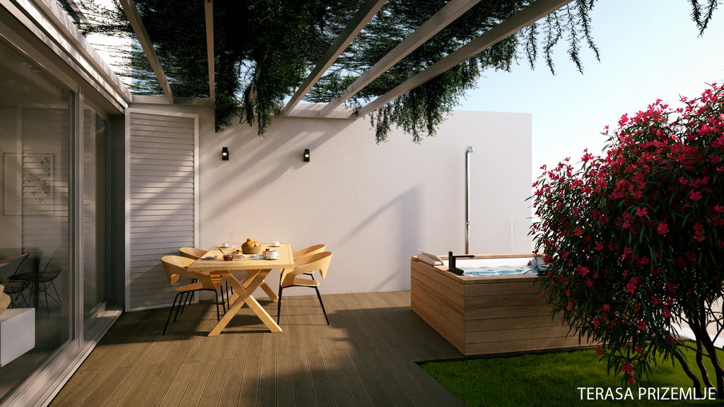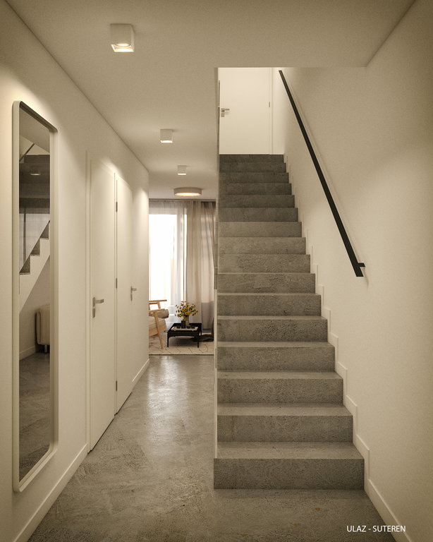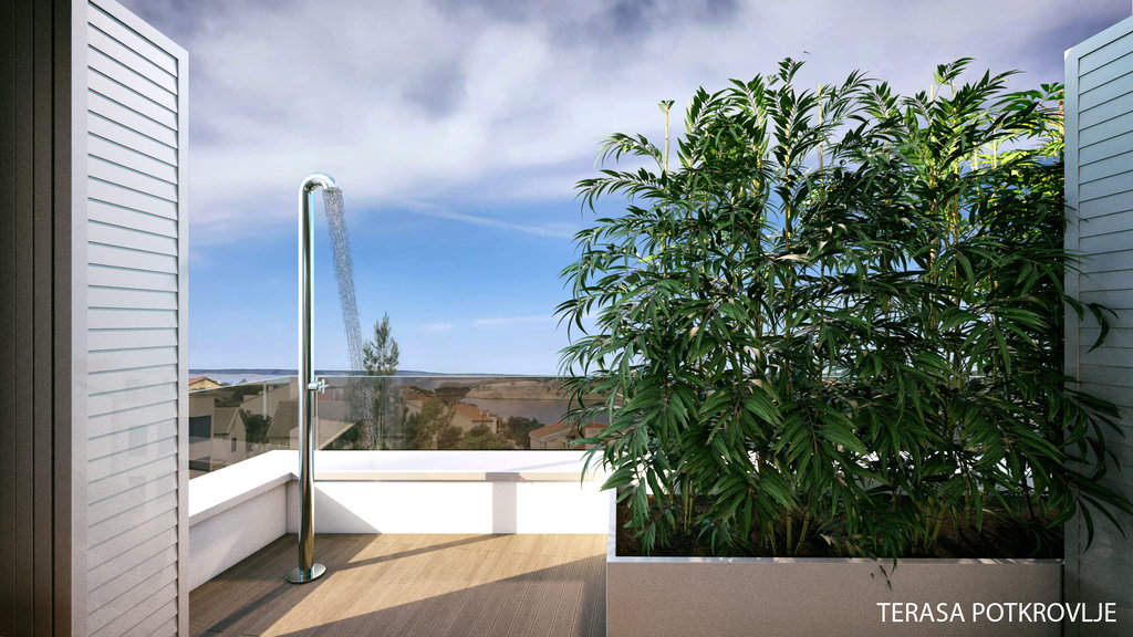 Prodaje se kuća u nizu/apartman u mirnom ribarskom mjestu Šimuni na otoku Pagu. Kuća se sastoji od četiri etaže, a koncipirana je tako da se može podijeliti na dva zasebna funkcionalna apartmana. Etaža 1: dnevni boravak s kuhinjom i blagovaonicom, spavaća soba, kupaonica, terasa, vrt, hodnik, stubište. Etaža 2: dvije spavaće sobe, dvije kupaonice, hodnik, stubište, spremište, podest. Etaža 3: dnevni boravak s kuhinjom i blagovaonicom, spavaća soba, kupaonica, hodnik, stubište. Etaža 4: loggia s funkcionalnom kuhinjom i prostorom za boravak/blagovanje obložena staklenim stijenama, vanjski tuš, zeleni krov, stubište. Ovu nekretninu posebnim čini to što se nalazi na svega 80 metara od mora i svih sadržaja, te način gradnje i izvedbe. Cijeli projekt građen je prema najvišim standardima s najkvalitetnijim materijalima, te spada u nZEB kategoriju(objekti gotovo nulte energije). U svaki stan ulazi se pojedinačno iz natkrivenog dijela preko vanjskih stuba. Sa zapadne strane kuće su vrtovi i terase s jacuzzijem, ovisno o željama kupca. Nosivi zidovi i stropne ploče napravljene su od armiranog betona debljine 20cm, a fasada će biti izvedena s toplinskom izolacijom od mineralne vune debljine 20cm, što osigurava optimalnu temperaturu tokom cijele godine. Ovaj projekt idealan je za sve one koji traže najsuvremeniju gradnju u mirnom mjestu poput Šimuna, a kupnja kuće može biti i idealna investicija s obzirom na mogućnost podjele na više apartmana. Za sva dodatna pitanja i razgled nekretnine stojimo Vam na raspolaganju. U slučaju posla posredovanja naše agencije postoji obveza plaćanja agencijske provizije. Za ovu nekretninu je kontakt: Filip, +385 91 288 0089